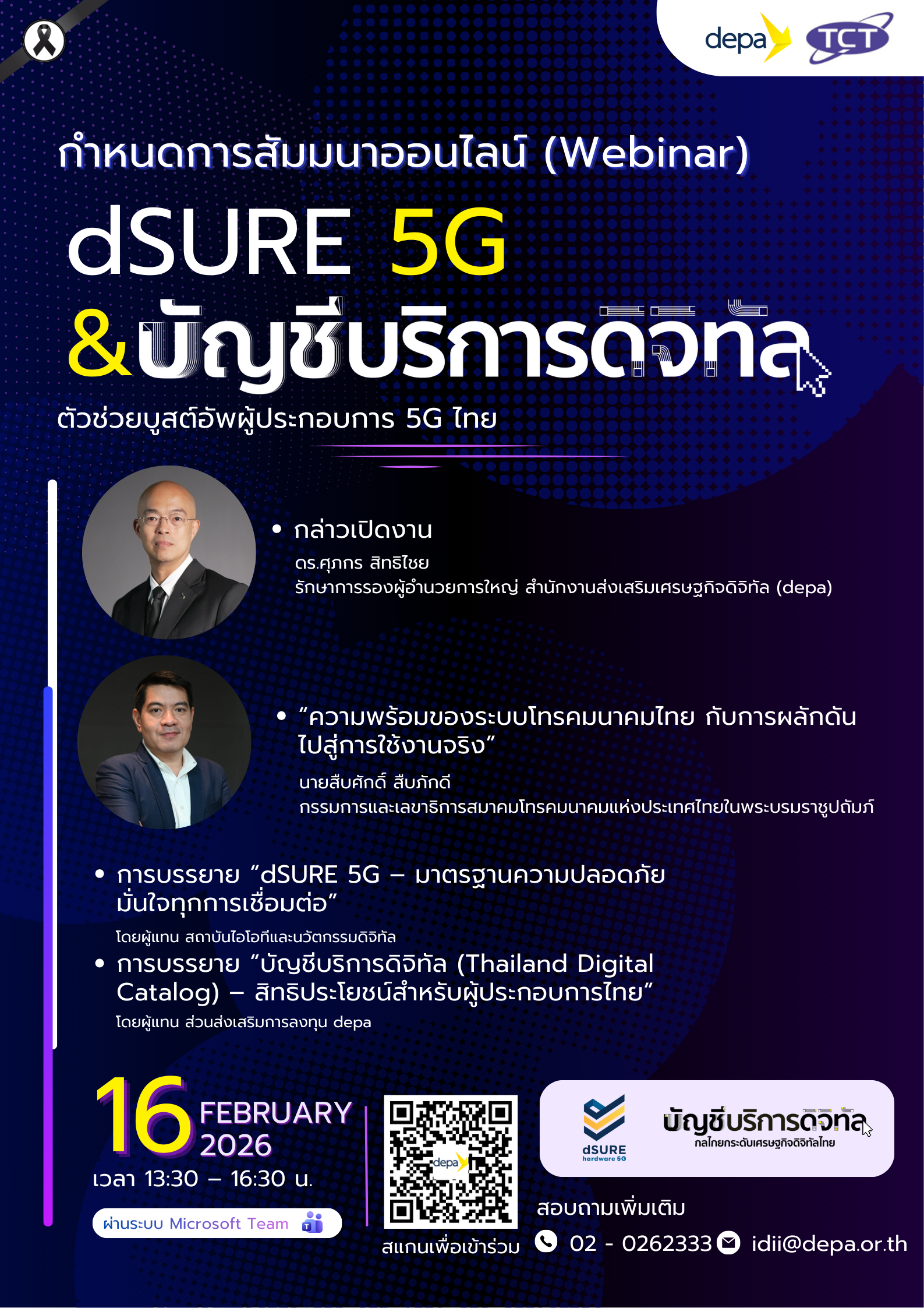 สัมมนาออนไลน์ (Webinar) หัวข้อ: "dSURE 5G และ บัญชีบริการดิจิทัล : ตัวช่วยบูสต์อัพผู้ประกอบการ 5G ไทย" ในวันที่ 16 กุมภาพันธ์ พศ.2569 เวลา 13:30 - 16:30 น. ทาง Microsoft Team